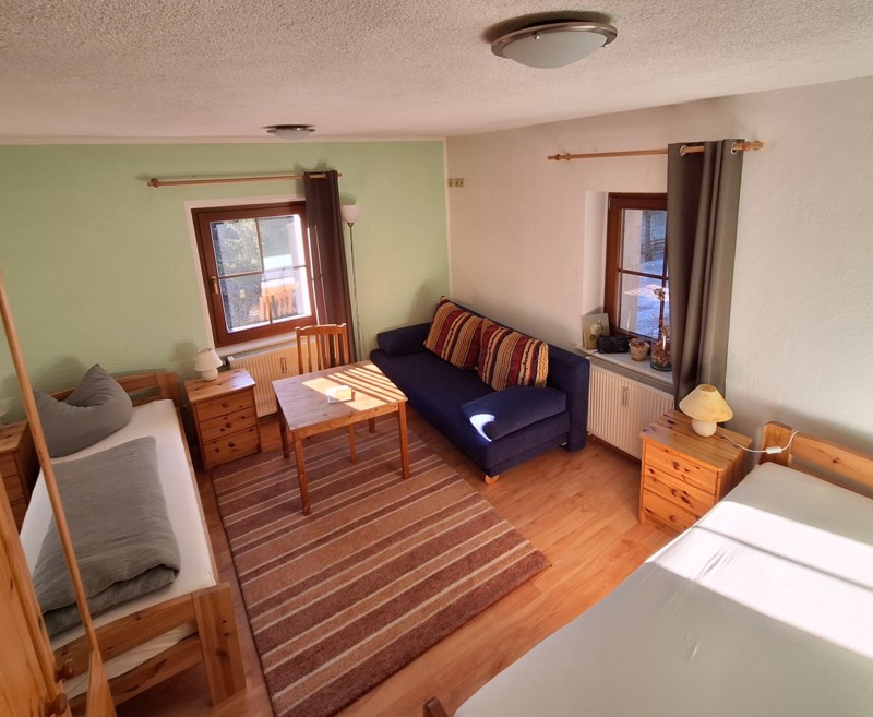 Unsere Fuchskanzel strahlt in einem natürlichen grün. Gelegen in der 1. Etage des Hauses bietet es mit dem Schlafwohnbereich und dem Bad ausreichend Platz für bis zu 4 Personen. Die Ausstattung sind zwei einzelne Betten und zwei mögliche Aufbettungen.